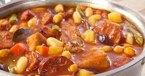 Deixe o bacalhau de molho na véspera, trocando a água várias vezes. Tire a pele e as espinhas antes de usar. Esquente o azeite em uma frigideira grande e frite os camarões limpos e o alho picado. Reserve. Refogue no mesmo azeite o arroz e o bacalhau. Coloque o caldo de galinha, a água, os tomates e os pimentões picados, a couve-flor, a fava, a ervilha, a páprica e o açafrão. Ferva durante 15 minutos em fogo alto. Espalhe os fundos de alcachofra e os camarões graúdos, sem mexer. Baixe o fogo ao mínimo e cozinhe mais 10 minutos. Retire o sal se necessário. Desligue o fogo e deixe descansar durante 5 minutos antes de servir.